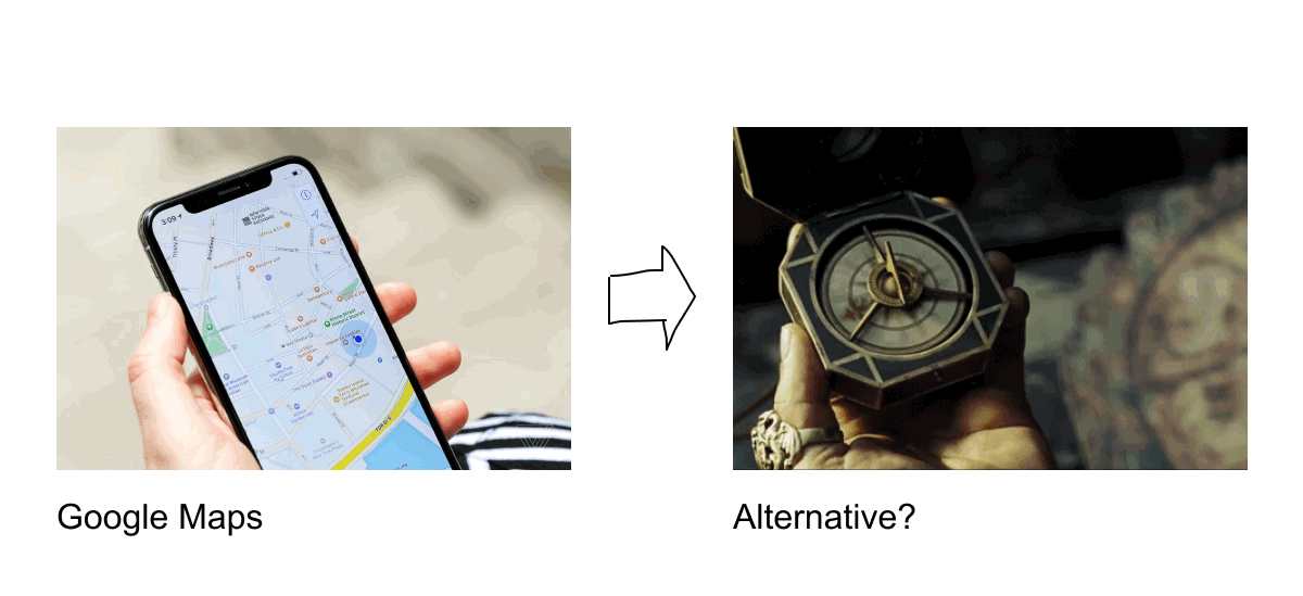 I started my research by looking at analogue navigation tools and came up with the idea of using a rotating dial to provide directions — like a compass, except it doesn’t point north.